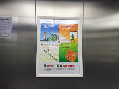 在天瑞,每一位員工都形成了良好的環(huán)保意識,這得益于天瑞無處不在的環(huán)保宣傳。在大樓的電梯間內(nèi),“多走路少坐電梯”海報異常醒目,每一個天瑞人都形成行動距離小于3樓不乘坐電梯的習慣。