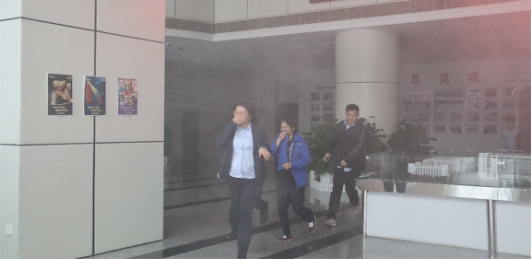 員工們捂住口鼻,有序地從緊急出口向外撤離