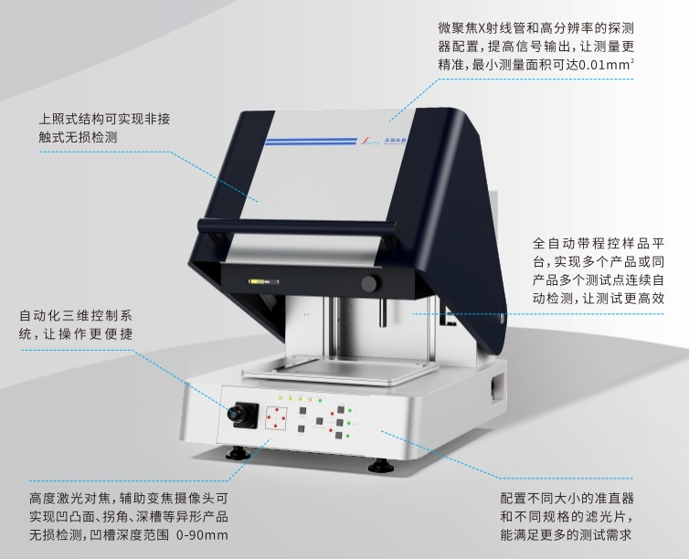 EDXThick800是一款全新上照式多功能自動(dòng)微區(qū)X熒光膜厚測(cè)試儀,既滿足原有微小和復(fù)雜形態(tài)樣品的膜厚檢測(cè)功能,又可滿足有害元素檢測(cè)及輕元素成分分析;搭載自動(dòng)化的X/Y/Z軸的三維系統(tǒng)、雙激光定位和保護(hù)系統(tǒng),可多點(diǎn)位編程測(cè)試,被廣泛應(yīng)用于各類產(chǎn)品的質(zhì)量管控、來料檢驗(yàn)和對(duì)生產(chǎn)工藝控制的測(cè)量。