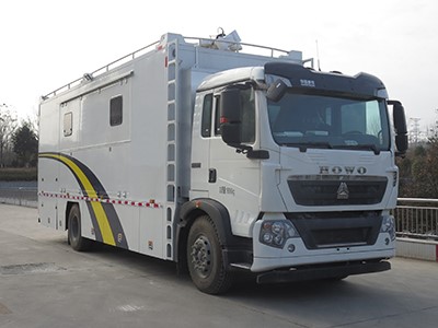 該車選用**重汽汕德卡牌二類底盤為平臺改裝而成。在駕駛室頂部 安裝有導流罩,廂體設(shè)計有鋁合金登頂梯,方便人員登頂檢修、瞭望,車 頂四周裝配裝飾套件,使整車外觀輪廓和線條更加美觀圓潤、動感流暢。