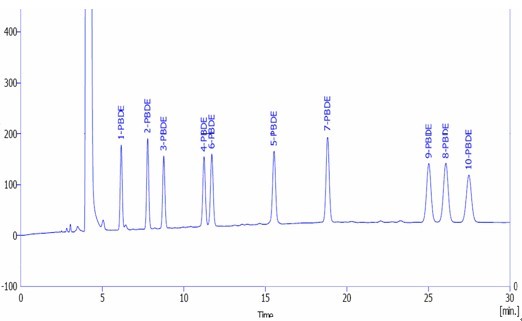 10種多溴聯(lián)苯醚標準混合溶液譜圖: