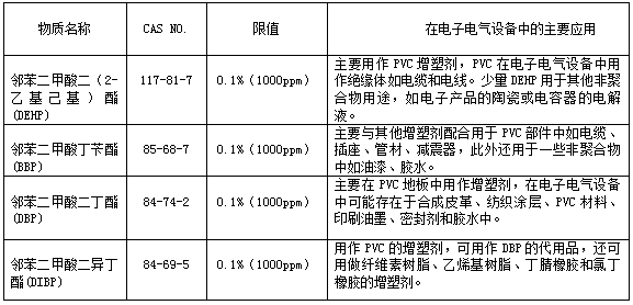 表一. RoHS 2.0新增4項鄰苯二甲酸酯物質(zhì)清單