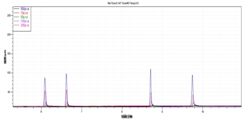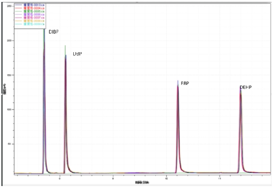 圖3. 4種鄰苯二甲酸酯類標準溶液重復性譜圖疊加圖