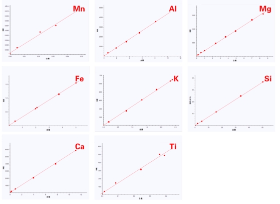 設(shè)定適當(dāng)?shù)臏y(cè)量條件,使用X射線熒光光譜儀掃描一系列含量已知的石墨標(biāo)準(zhǔn)物質(zhì)或石墨二次標(biāo)樣,該系列樣品中需關(guān)注元素Mg、Al、Si、K、Ca、Ti、Mn、Fe等元素含量與強(qiáng)度的一次線性校正工作曲線。然后,對(duì)未知石墨樣品進(jìn)行測(cè)量。