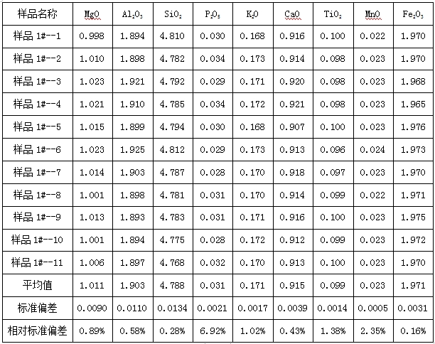 圖3為石墨1#樣品的X射線熒光譜圖,從譜圖可知,樣品的含有少量Mg、Al、Si、P、K、Ca、Ti、Mn、Fe等元素。使用該樣品進(jìn)行重復(fù)性測(cè)試之后,檢測(cè)結(jié)果中計(jì)算了對(duì)應(yīng)元素的氧化物含量,測(cè)試結(jié)果中呈現(xiàn)出較好的重復(fù)性。