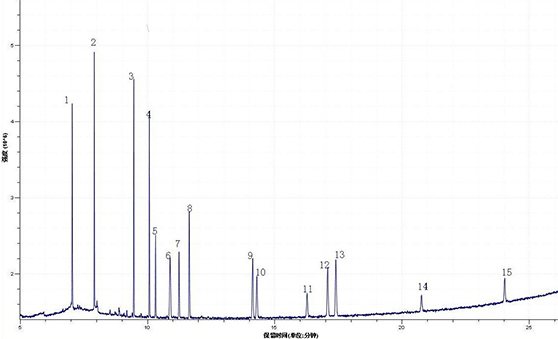 3.1 15種塑化劑混合標(biāo)準(zhǔn)溶液總離子流監(jiān)測(cè)圖(TIC)如下所示: